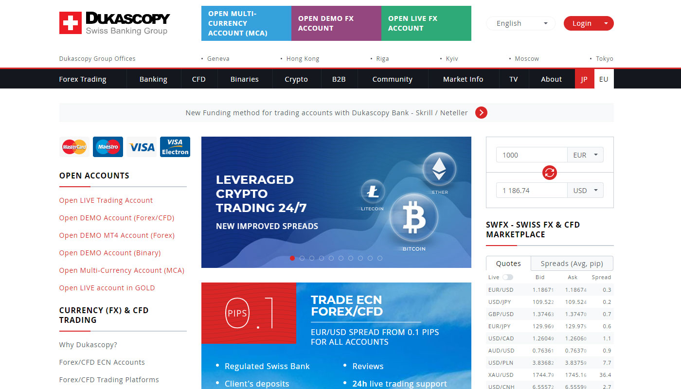 Dukascopy Bank was founded by Andre and Veronika Duka in 2004 in Geneva. The bank is regulated for financial securities by the Swiss Financial Market Supervisory Authority FINMA. The website provides registered clients with a trading platform available in 13 different languages. From the homepage, clients can register a demo, live or multi-currency trading accounts and begin trading immediately. Trader verification is only compulsory to withdraw huge amounts from the platform.