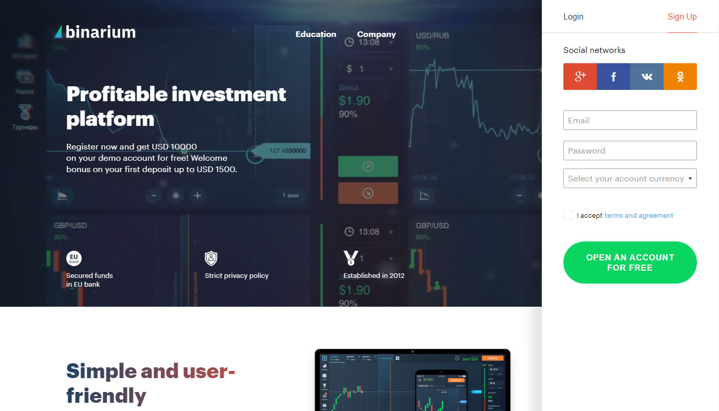 Binarium is a binary options brand registered in Nicosia, Cyprus with registration number HE321566. Their registered address is Souliou, 18, 2018 Strovolos, Nicosia, Cyprus and the office address is Office 01, 9 Kappadokias, Dasoupoli, 2028, Nicosia, Cyprus. Binarium was established in 2012 in St. Vincent and the Grenadines and since then it has offered brokerage services for clients seeking to trade the financial markets.