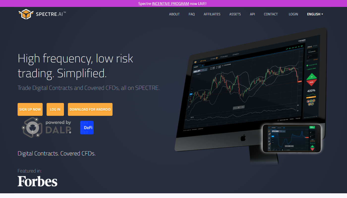 Spectre is among the pioneers of DeFi brokerage, having incorporated blockchain technology into its trading system. It is essentially a broker-less system, because it does not hold clients' funds. Spectre rather provides access to traders to trade with their funds directly from their wallets. Spectre runs a Decentralized Autonomous Liquidity Pool on the Ethereum network. This, new orders are added to the ledge as they are filled.