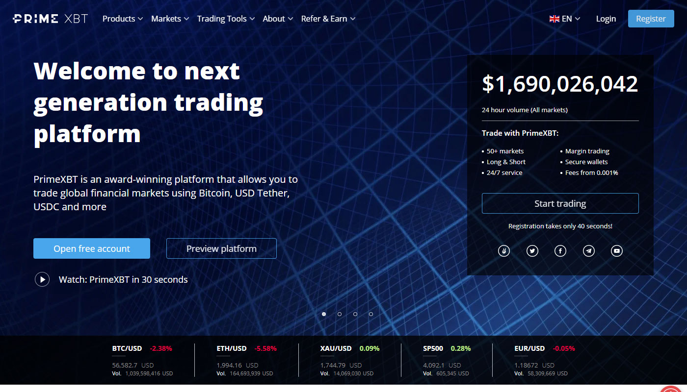 PrimeXBT broker is a cryptocurrency broker for the financial markets. PrimeXBT offers a platform for trading forex, binary options, and CFDs. PrimeXBT was founded in 2018 and is registered under the PrimeXBT Trading Services LCC in St. Vincent and the Grenadines with registration number 222LCC2019. The website is available in 16 multiple languages. Clients can access the products and services on the website from over 150 countries. PrimeXBT is powered by Amazon AWS, a cloud service that enhances user experience.