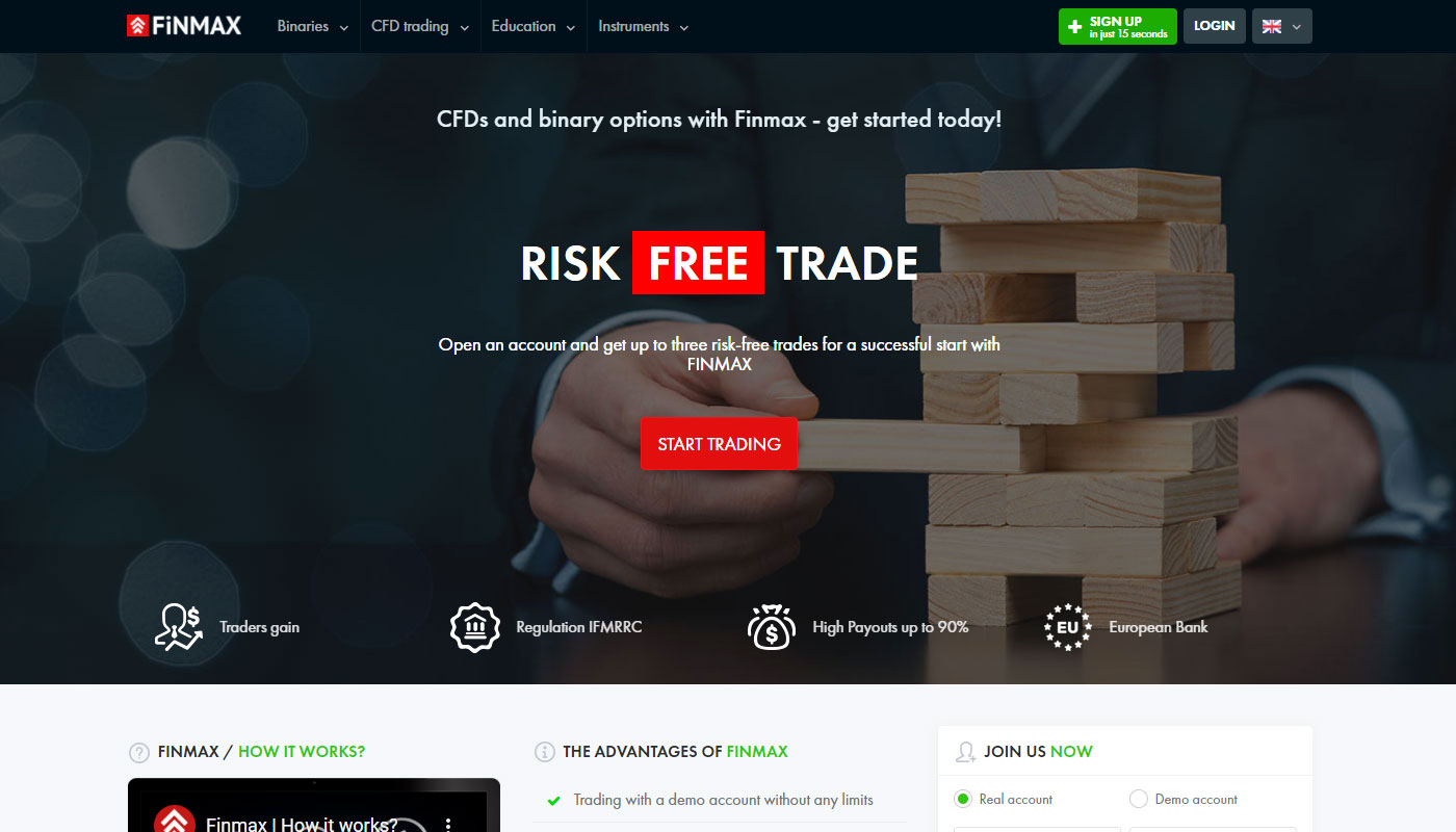 Finmax is a binary options broker in Bulgaria that offers a platform for clients to trade the financial markets. Since 2015, Finmax has provided brokerage services for traders across numerous countries. Finmax is regulated by the IFRMMC with license number RU 0395 AA V0150. The website is available in multiple international languages including English, Spanish, Italian, Arabic, Portuguese, French and Russian.